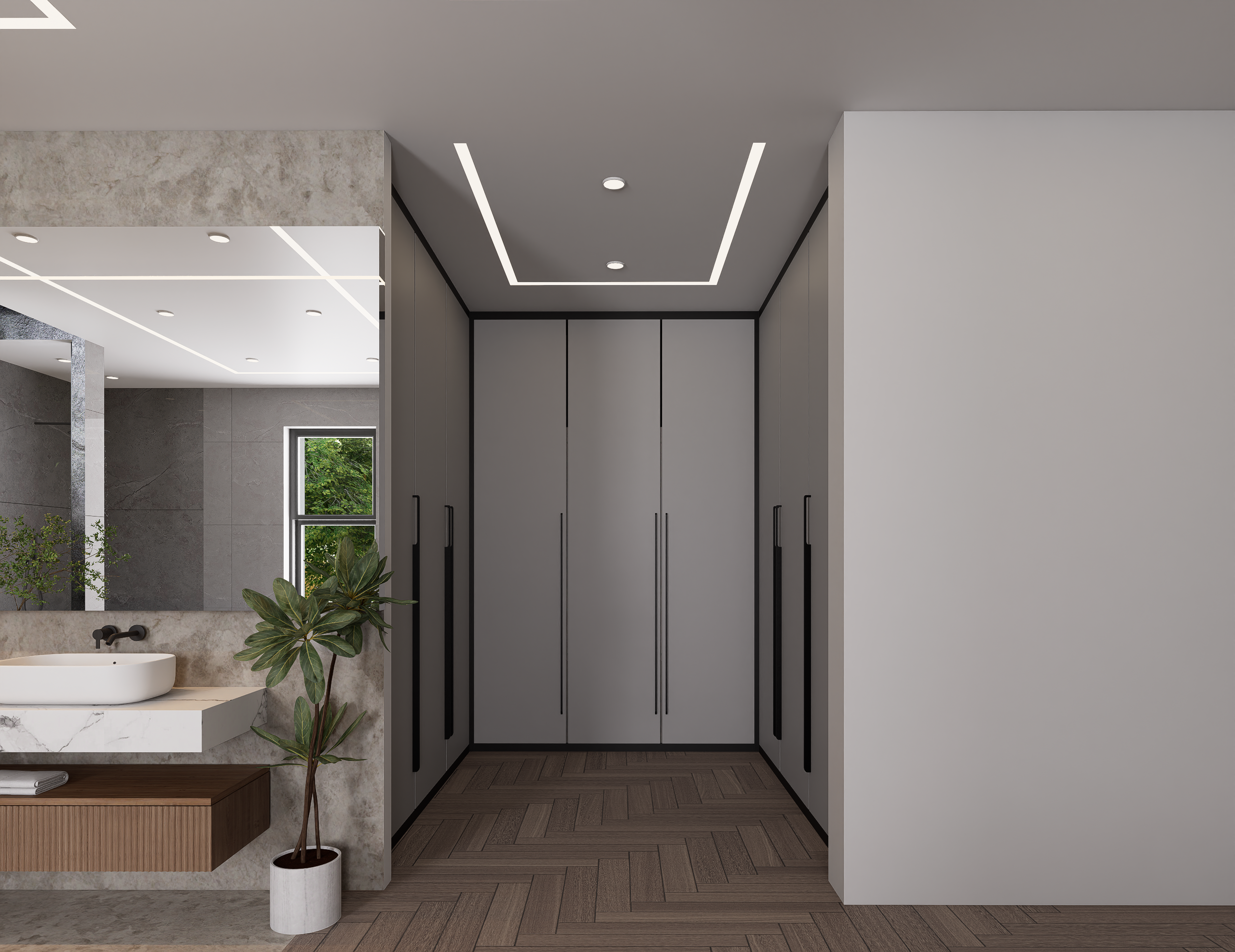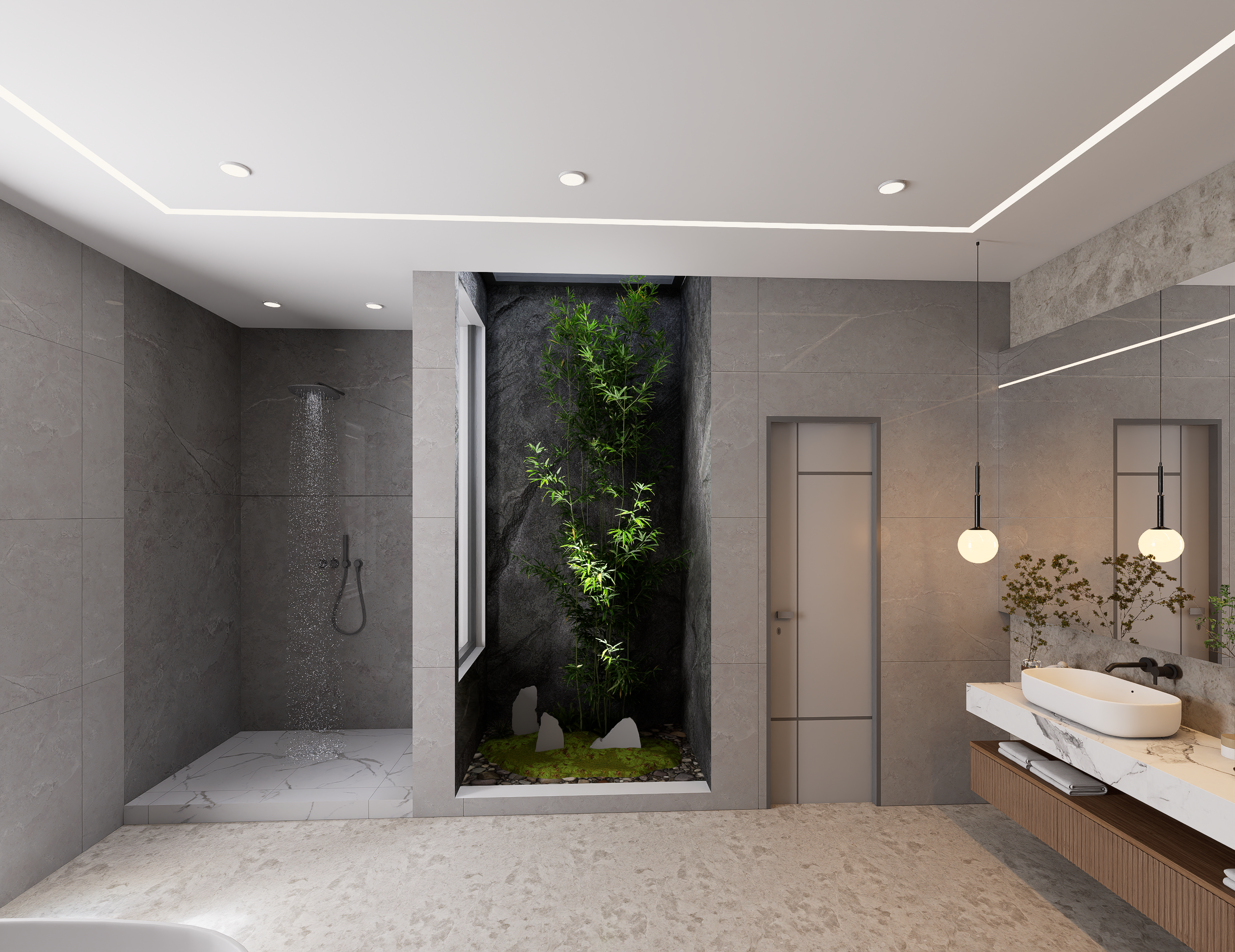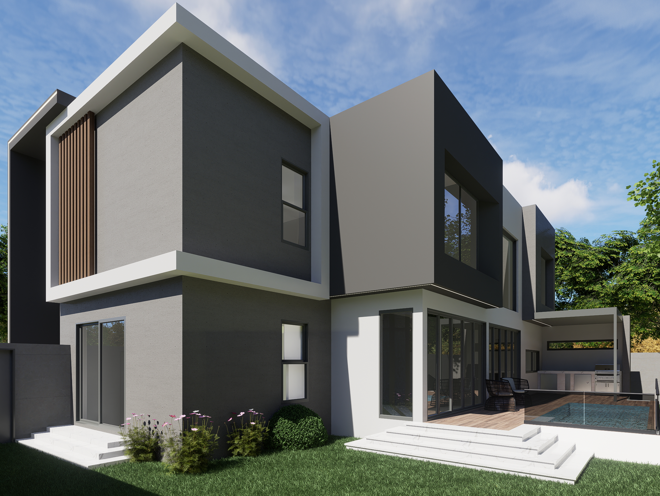 Our approach was rooted in maximizing natural light, promoting open-plan living, and utilizing high-quality, durable materials. We achieved an aesthetic balance by contrasting light, crisp walls and subtle cabinetry with dark, dramatic stone and warm wood accents. The result is a home that feels both expansive and intimately comforting.