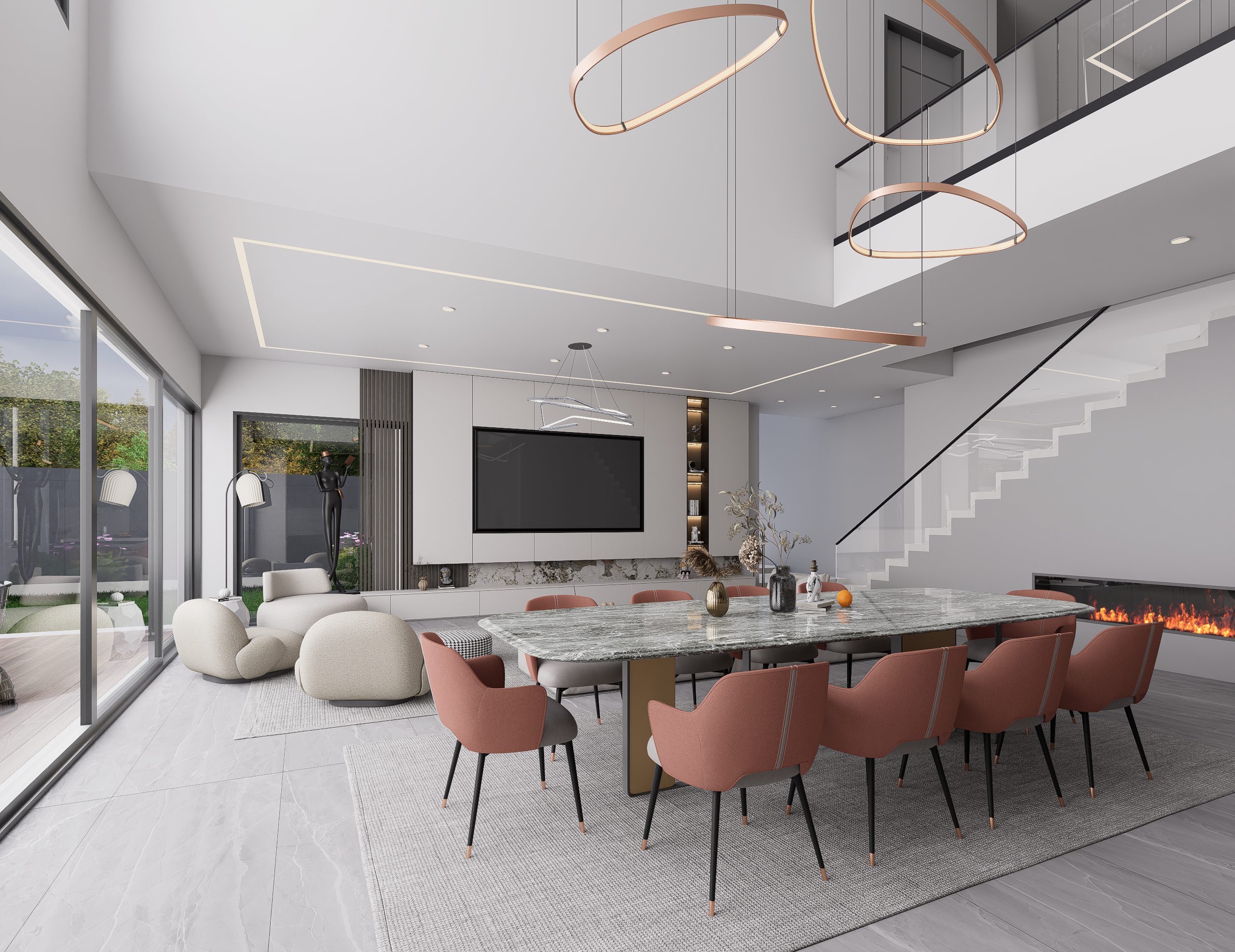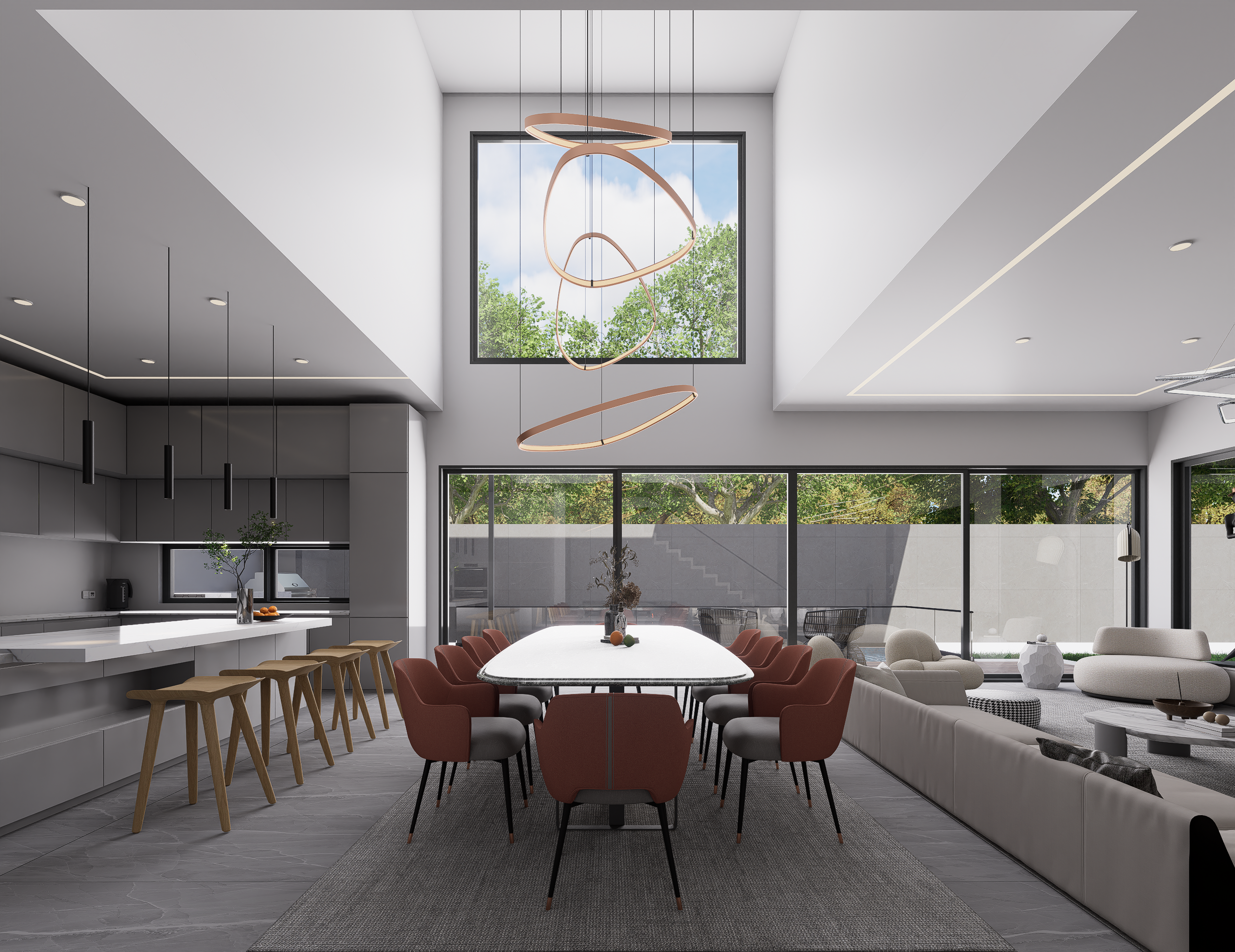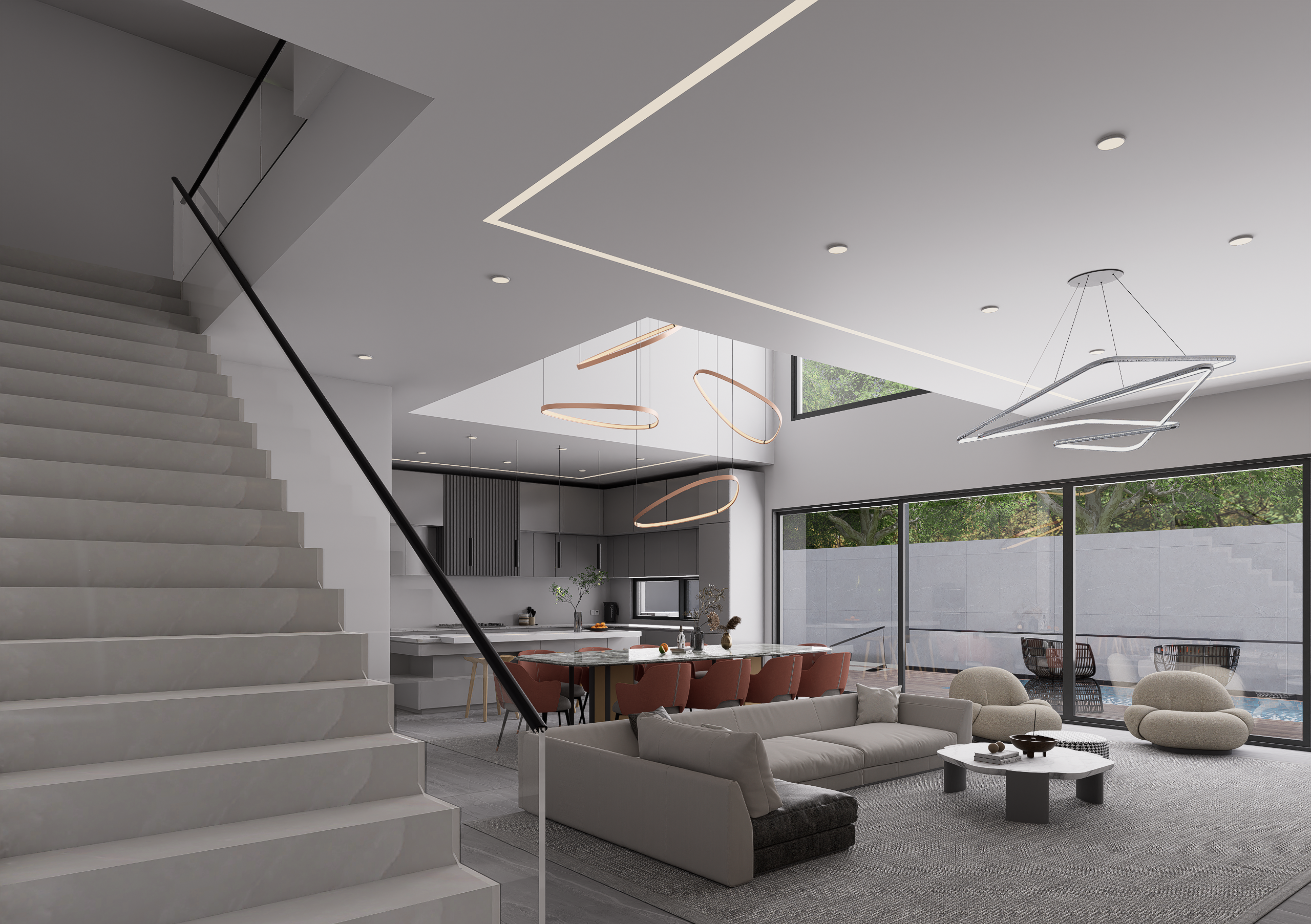 This project is defined by a meticulous blend of neutral palettes, rich textures, and dramatic lighting, culminating in a series of spaces that flow seamlessly from one to the next, promoting both grand entertaining and quiet relaxation.
